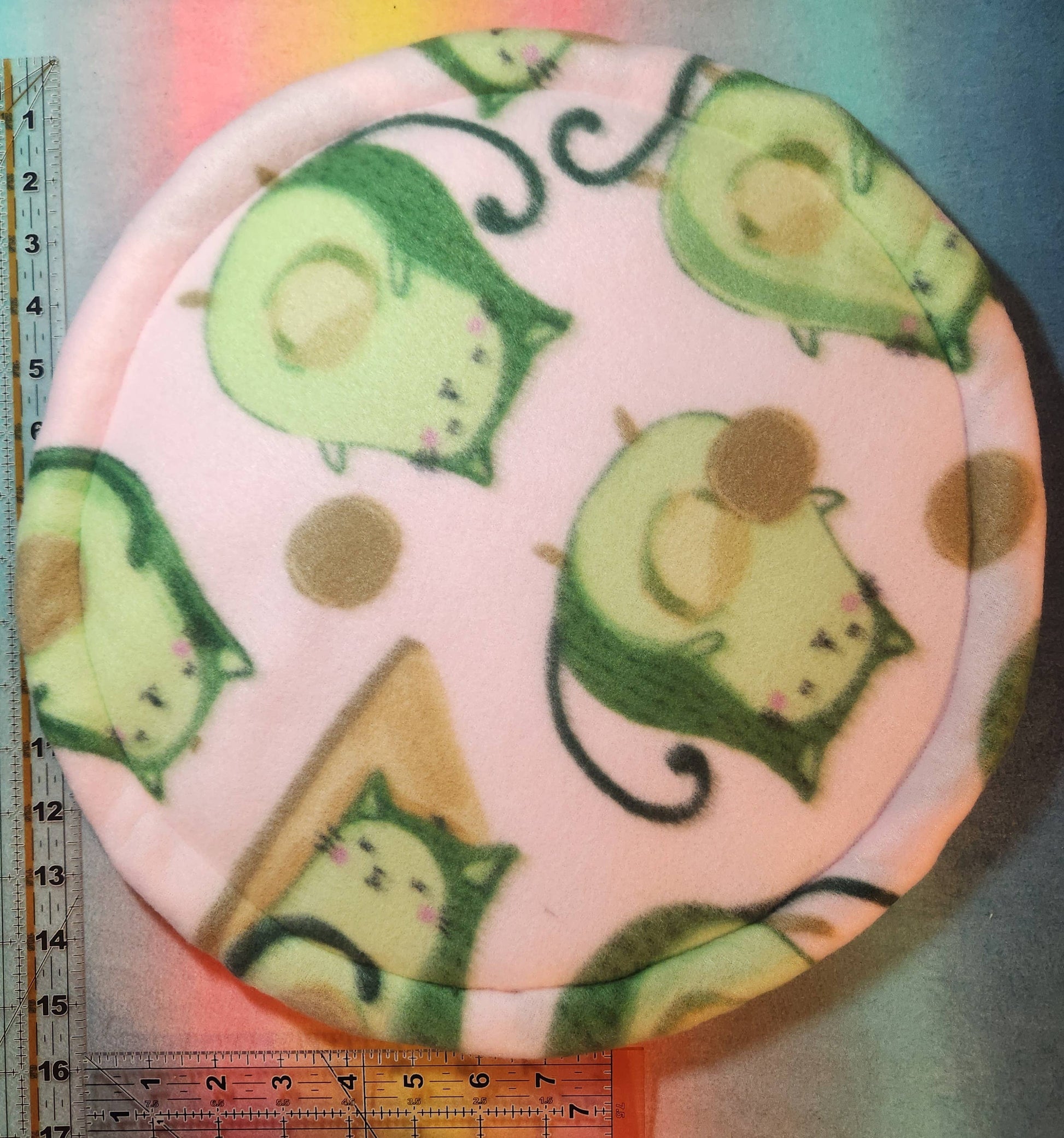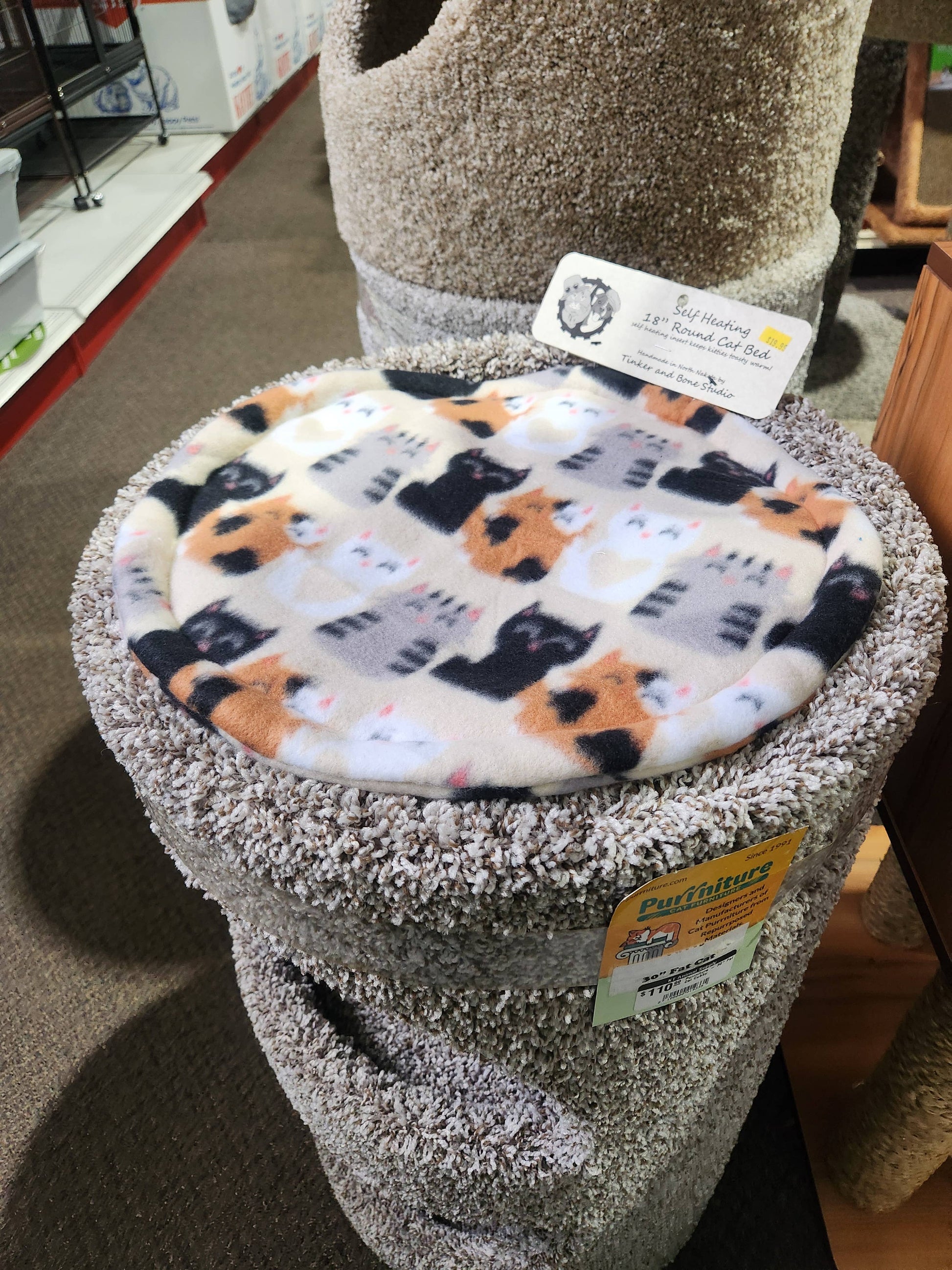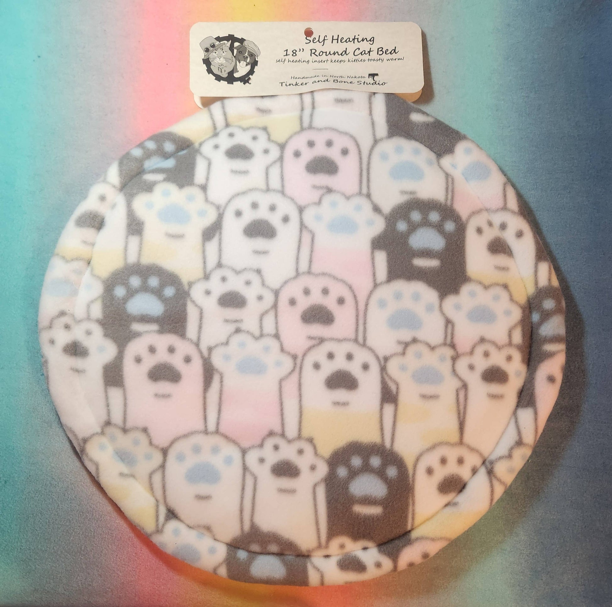 16" fleece round cat bed with a self heating insert. Handmade in North Dakota. No electricity required.
