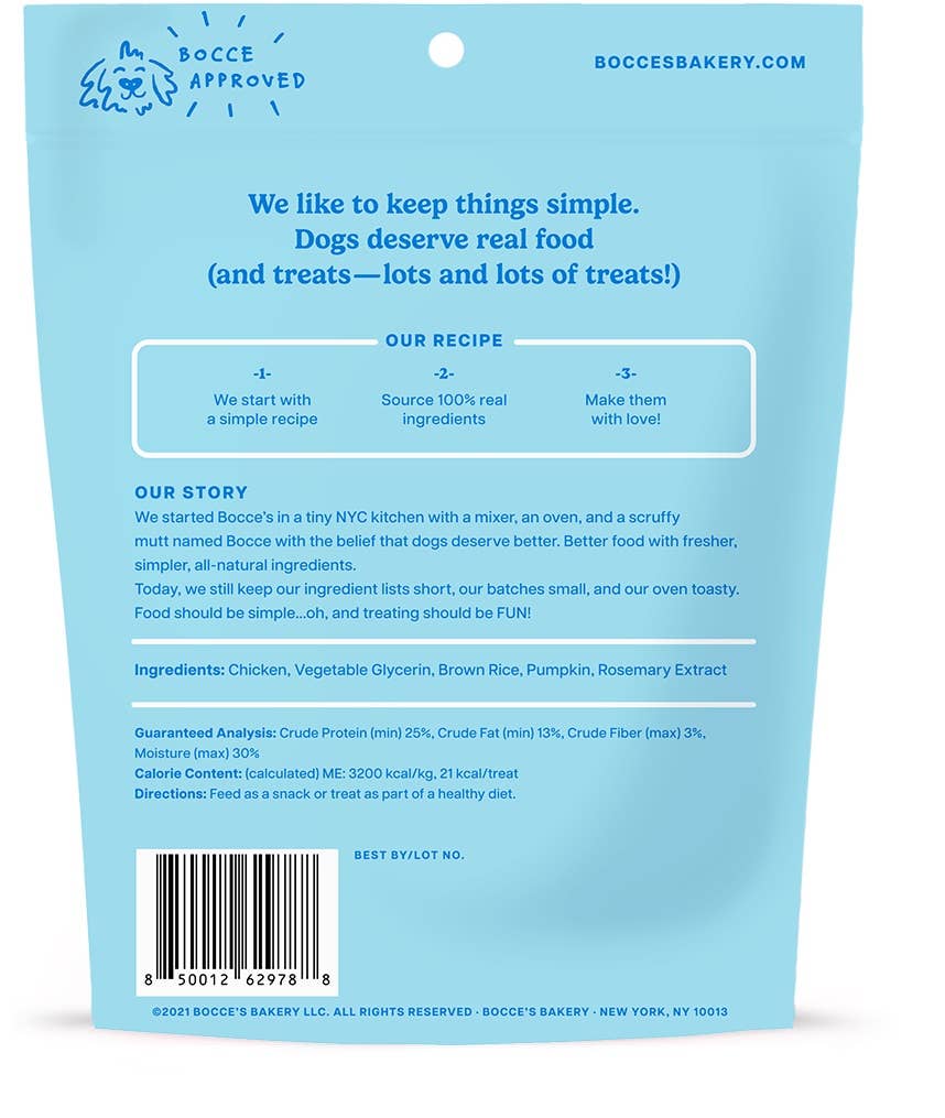 All-natural jerky sticks baked with USA chicken (our first ingredient!) and boosted with easy to digest pumpkin (no added salt or sugar— of course) in a chewy texture that will keep your pup wanting more! Did we mention they’re 25% protein?