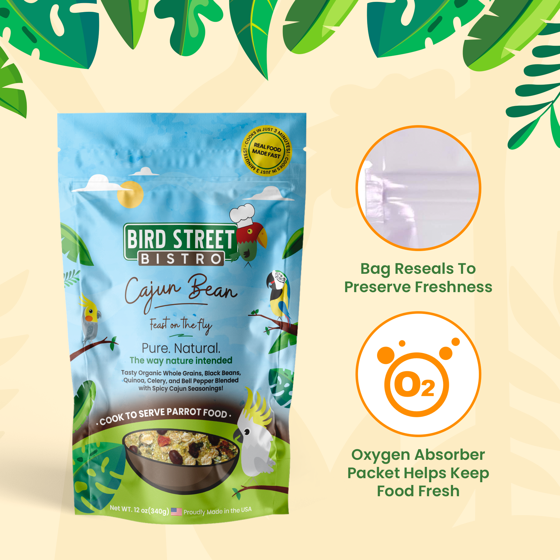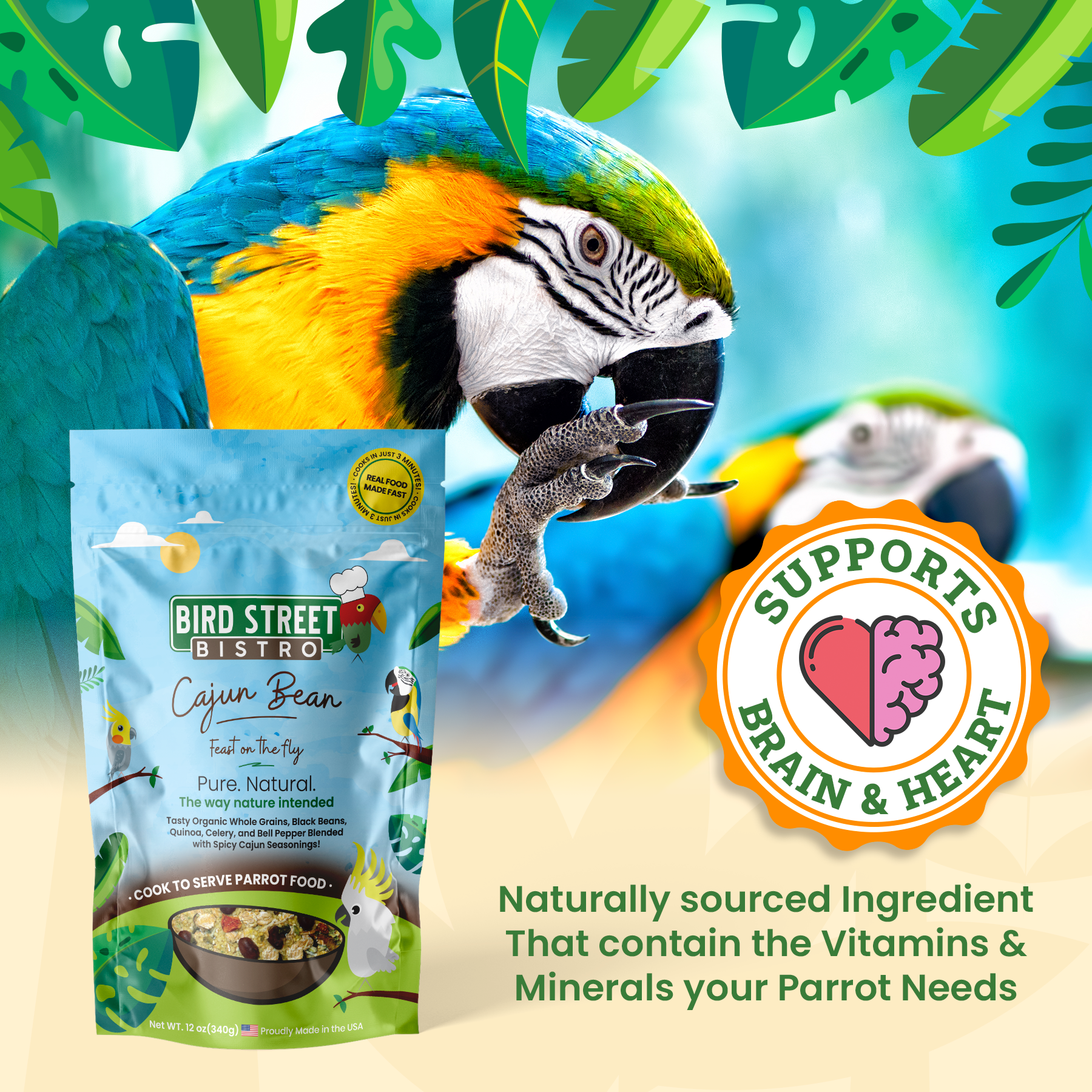 Product Features: Cajun Bean Parrot Food Treat your parrot to a delicious meal with fresh, authentic Cajun flavors. Cajun Bean parrot food is a holistic parrot food that delivers a balanced nutrition with organic couscous, hulled millet, quinoa, and more. Dried fresh vegetables and beans add satisfying texture that your parrot, macaw, or cockatoo will love to crunch on! Bell peppers, corn, and celery aren’t just good for you – they’re also essential for your feathered friend. Healthy food for birds should be rich in texture and color to encourage foraging. They’ll love the wide range of natural ingredients and flavors. Exquisitely seasoned with bold Cajun flavors that smell just as good as they taste. Make mealtimes more interesting with heart-healthy cayenne pepper, vitamin-rich basil, warm paprika, and earthy cumin. * Organic and 100% all natural ingredients * Rich in amino acids and essential vitamins * Easy to cook in just 3 minutes