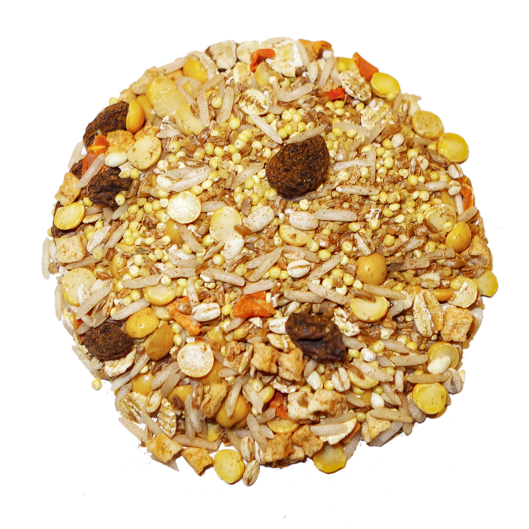 CinnaSpice Bird Food Ingredients: All natural Basmati rice, organic hulled millet, organic yellow split peas, organic pearled barley, organic couscous, currants, non-GMO dried carrot, organic rolled oats, organic rolled barley, unsulphured dried apple, non-GMO almond pieces, organic coconut, organic ceylon cinnamon, anise seed.