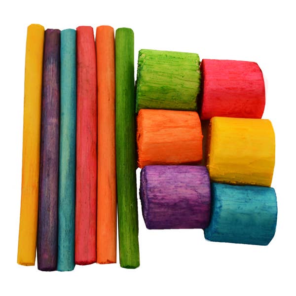 A colorful assortment of fun to chew jute sticks and sola wood pieces that will thrill your bird or small critter. (12 pieces)