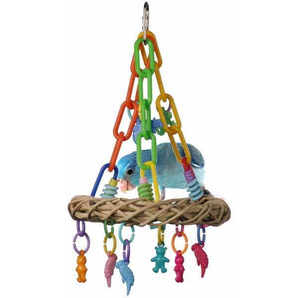 Looking for a cute colorful swing for your bird? Look no further than our Jungle Ring bird toy. Brightly colored plastic chain and links connect to a sturdy vine ring, with charms that bob and sway.