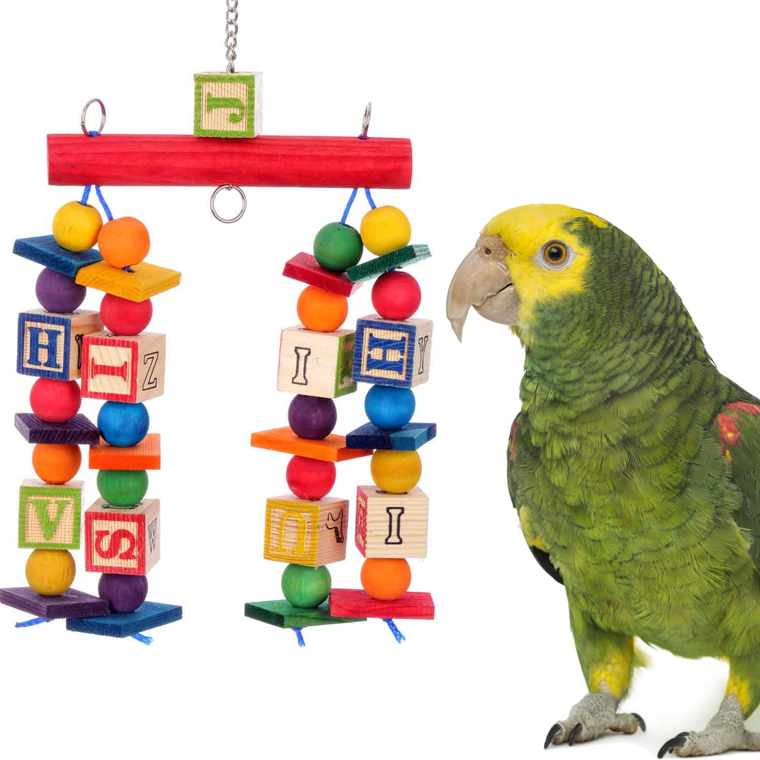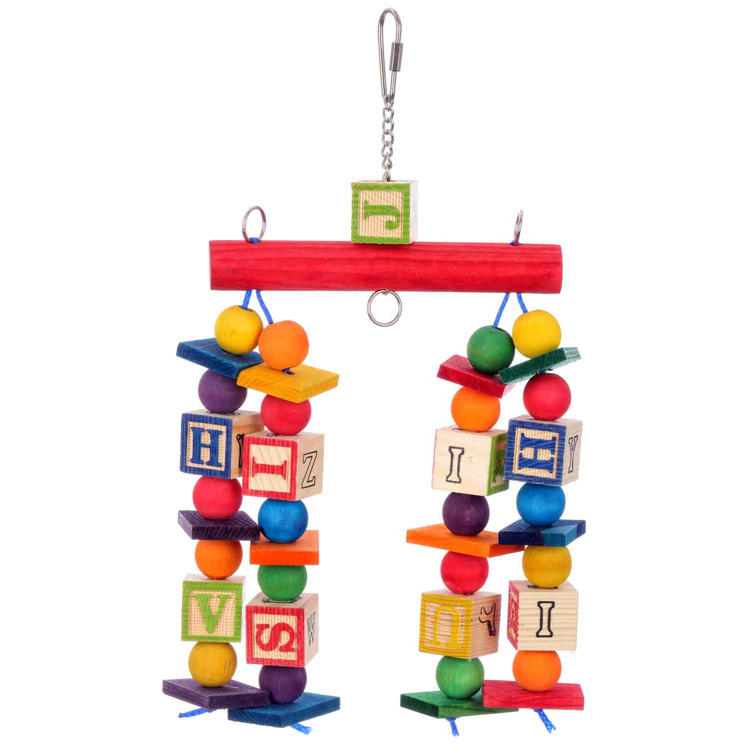 Crafted with colorful pine slats, hardwood beads, ABC blocks, and "Polly Rope". Easily attaches to the cage with bird-safe hardware.