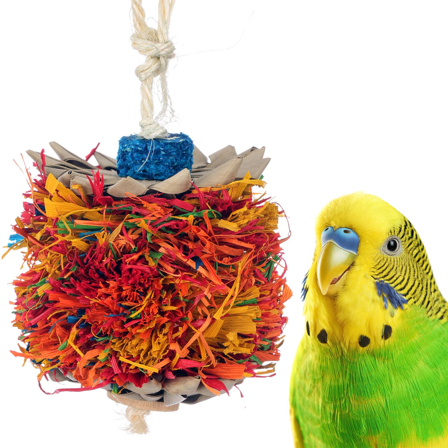 Colorful corn husk sandwiched between two crunchy, woven palm flowers and suspended on sisal rope.