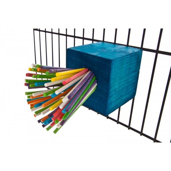 Paper lollipop sticks that birds love to chew and peel, bunched together in a sturdy wooden block. Bolts to the side of the cage.